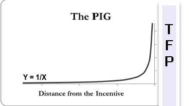 Mr. E.’s failure to anticipate what would happen to him as he neared the casino demonstrates that he doesn’t know himself. The silver lining of his painful mistake is that it gives his research team the opportunity to study cause and effect from both the inside and the outside. When he does, he will meet: The Problem of Immediate Gratification [the PIG] — the hyperbolic relationship between the trance-formative power [TFP] of an incentive and its immediacy [in terms of space, time, or psychological distance]. The hyperbolic relationship between the immediacy of the gratification and its TFP explains its stealthy ability to undermine the best of intentions. An incentive’s influence on subjective reality increases gradually at first but progressively rapidly as the incentive nears. As he walked past the casino, its influence on his subjective reality increased so rapidly that he was trance-formed before he knew what hit him, and the man who promised his wife he would never gamble was no longer present to influence his overt actions. He did not lose control of the vehicle; he lost control over who was operating it.